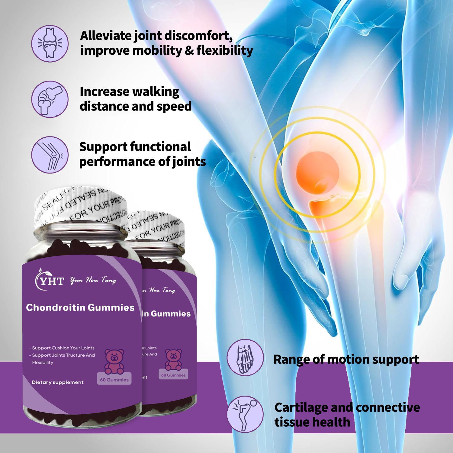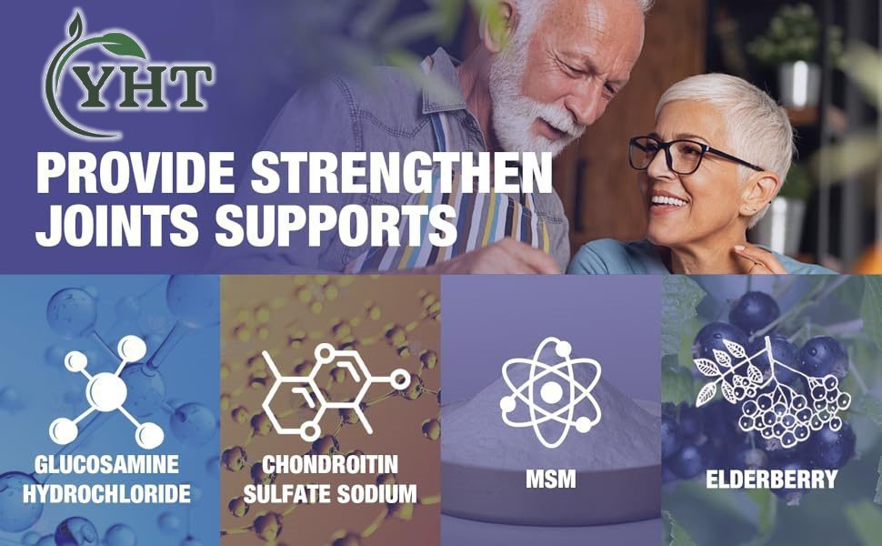 YHT joint support supplement Glucosamine Chondroitin Gummies are loaded with 1500mg glucosamine, 100mg MSM and 200mg Chondroitin to help assist with comfort, strength, mobility, flexibility and lubrication.